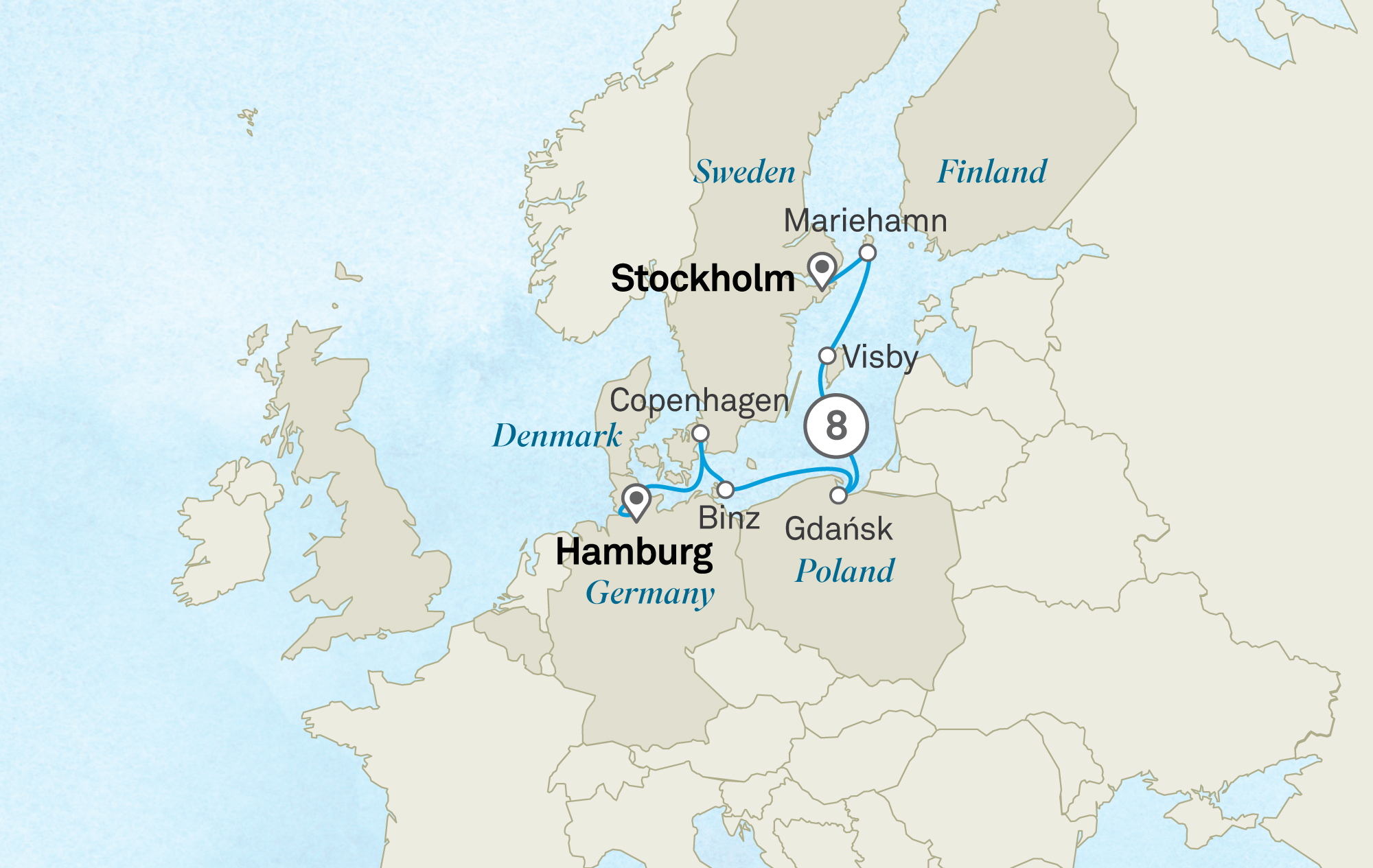 Hamburgo | Copenhague, Dinamarca | Binz, isla de Rügen, Alemania | Gdansk, Polonia | Visby, isla de Gotland, Suecia | Mariehamn, islas Åland, Finlandia | Estocolmo, Suecia